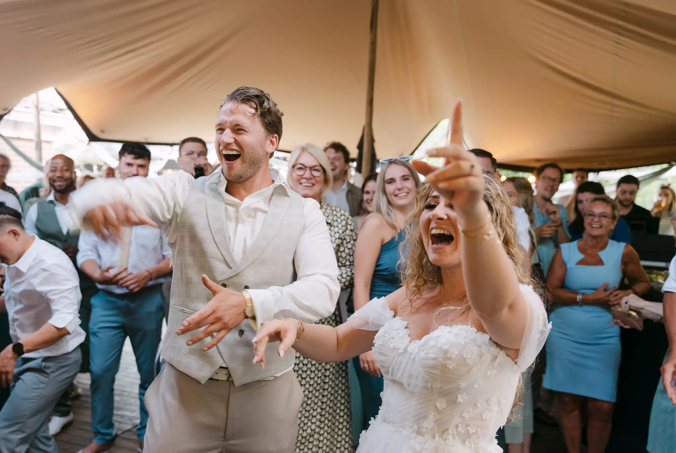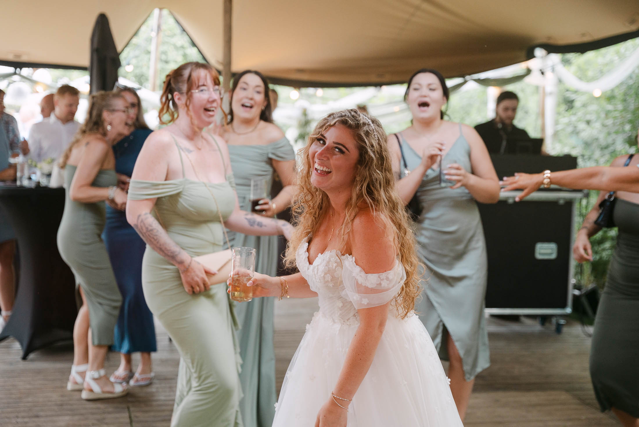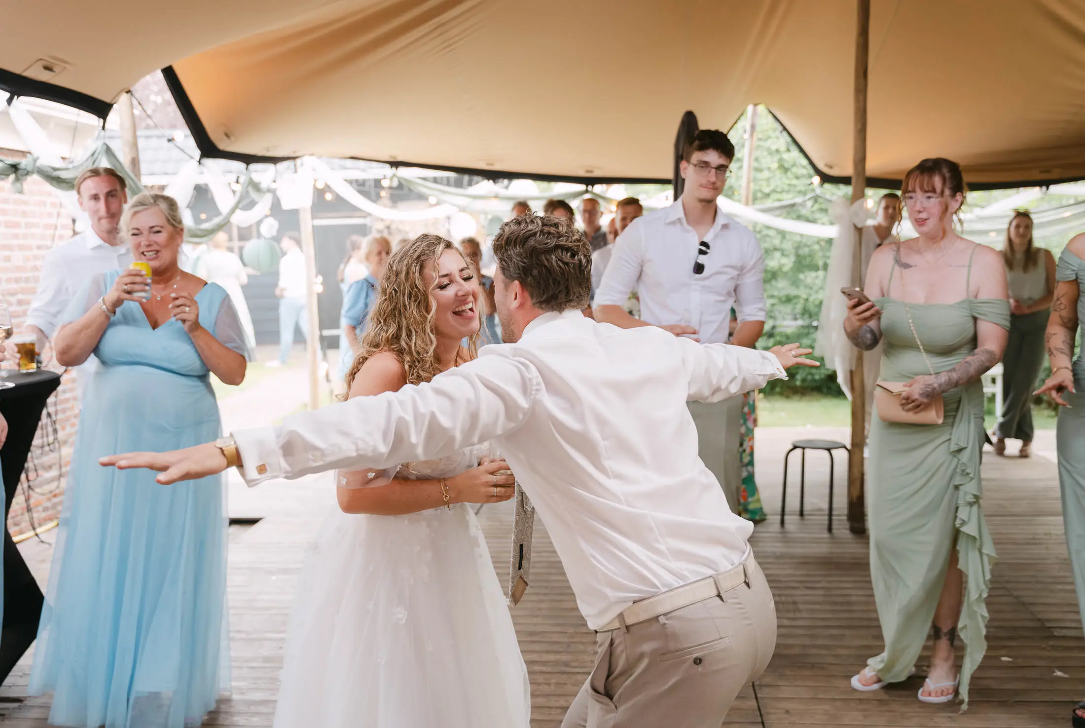 Rob en Cindy maakten van hun bruiloft een feestje dat ik niet snel zal vergeten. In een dorpje net buiten Leeuwarden verzamelden ze al hun vrienden en familie. In de tuin van hun ouders stond een grote tent, het was heerlijk weer en er werd veel gelachen. De  dag voelde meer als een klein festival, dan als een bruiloft. En dat was precies de bedoeling! Rob en Cindy hun grote dag was een groot feest, gevuld met heel veel dansen, plezier en samen genieten.